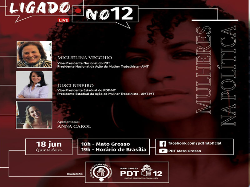 O PDT do Mato Grosso realiza na próxima quinta-feira (18), às 18h (horário de Mato Grosso, e 19h - horário de Brasília) a segunda live de debate do projeto "Ligado no 12", com o tema: Mulheres na Política. No evento, estará presente a presidente nacional da Ação da Mulher Trabalhista (AMT)
